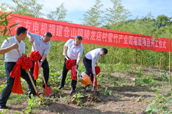 在PA视讯电机捐建的雷竹产业园,王军、徐学文和仓山镇党委书记徐万俊、骑龙店村支书陈嗣凯共同参加了产业园灌溉项目开工仪式。据了解,雷竹产业用水和灌溉项目是PA视讯电机2022年重点帮扶项目,预计将于9月30日前完工。