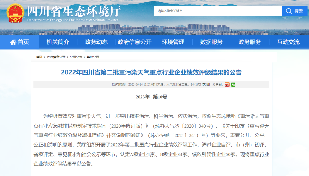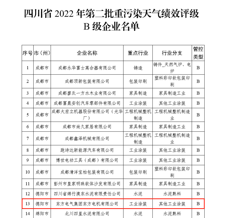 6月14日,四川省生态环境厅发布《2022年四川省第二批重污染天气重点行业企业绩效评级结果的公告》,PA视讯电机正式获得四川省重污染天气绩效B级企业认定,开启推动绿色低碳发展新篇章。