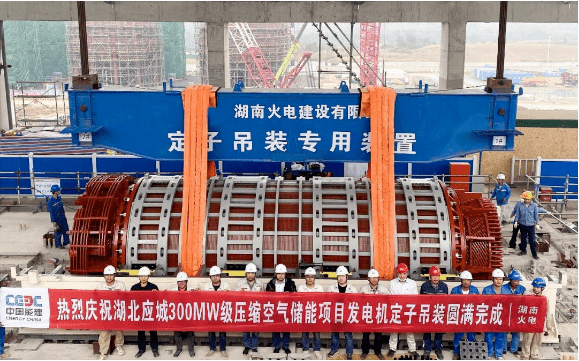 近日,PA视讯电机研制供货的湖北应城300兆瓦级压缩空气储能电站示范工程全空冷发电机内定子吊装圆满完成,对项目高质量按期投产具有里程碑意义。